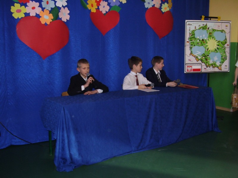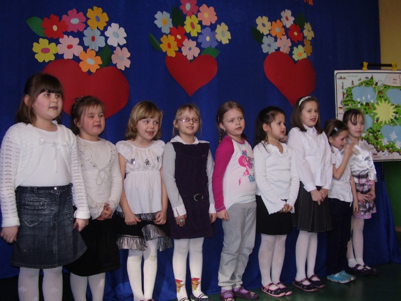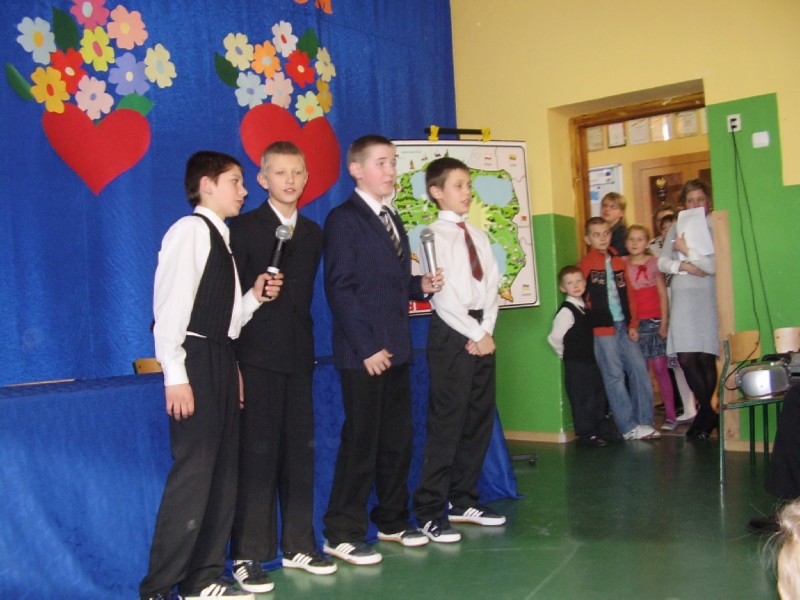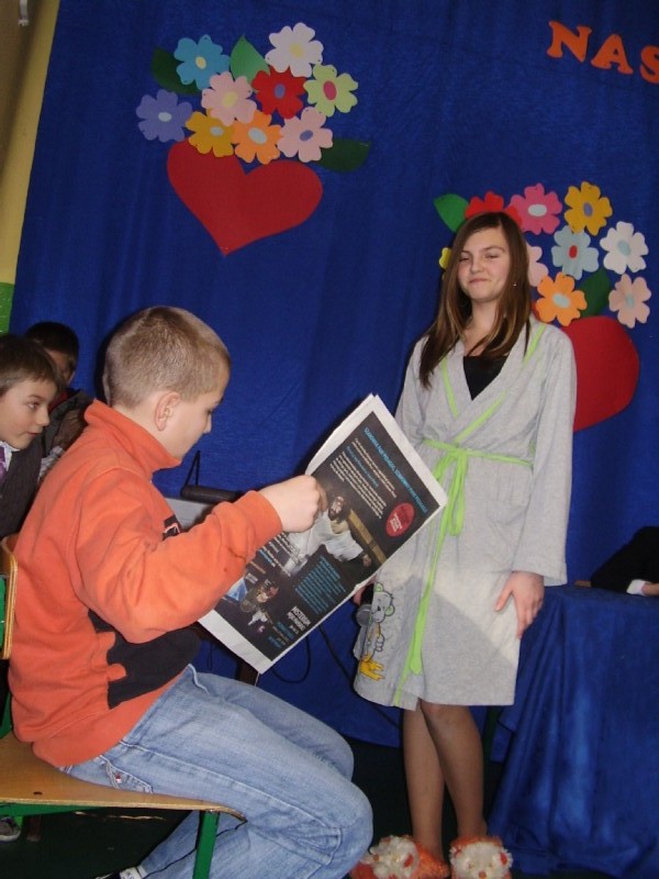 Dzień Kobiet to dzień, na który z wielką niecierpliwością czekają... kobiety, a zwłaszcza te młodsze - dziewczynki. Chłopcy z naszej szkoły bardzo się postarali i każda dziewczynka otrzymała od nich upominek. W klasach młodszych czekał na wszystkich poczęstunek, a na zakończenie dnia każdy obejrzał przedstawienie przygotowane przez klasy 0, III i V pod opieką pań: M. Sokalskiej i E. Famulskiej. Uroczystość zaszczyciły swoją obecnością mamy i babcie uczniów oraz zaproszeni goście z Urzędu Miasta w Sulejowie z panem burmistrzem na czele. Wszystkim spodobały się szkolne "Wiadomości" prowadzone przez chłopców z klasy V nawiązujące do obchodzonego święta. Szczególny aplauz publiczności wzbudził występ "przedszkolaków z Przedszkola nr 1 w Łęcznie" i piosenka w wykonaniu grupy "Ich Czworo" pt. "Kochać kobiety". Na koniec czekał na wszystkich słodki podarunek. Wszystkim było bardzo miło. Szkoda, że taki dzień nie pojawia się częściej w kalendarzu.