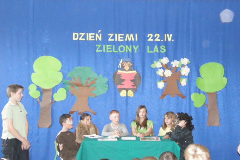 Światowy Dzień Ziemi - to nazwa akcji prowadzonych corocznie wiosną, których celem jest promowanie postaw ekologicznych w społeczeństwie. 28 kwietnia, co stało się już tradycją, obchodzono Dzień Ziemi w naszej szkole. Tego dnia wszyscy zebraliśmy się na sali gimnastycznej. Uczniowie wystąpili w inscenizacji pt. "Bajka o Jasiu śmieciarskim”, przygotowanej przez panie E.Buksę i U.Pązik . Słowami wierszy i piosenek nawoływano do ochrony przyrody. Ciekawość zebranych wzbudziły kostiumy występujących uczniów. Pojawiły się postacie takie jak: lis, wilk, sowa, słowik i zając. Ich zadaniem było uświadomić tytułowemu bohaterowi oraz zgromadzonym widzom jakie szkody przynoszą lasom i ich mieszkańcom wyrzucane tam śmieci. Przedstawienie było niezwykle ciekawe i pouczające.