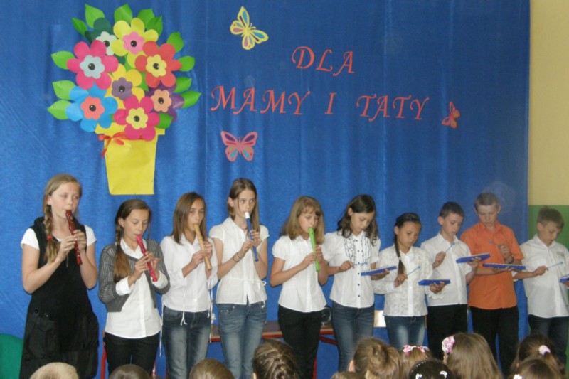 26 maja bardzo uroczyście obchodzono w naszej szkole święto mam. W pięknie udekorowanej sali zaproszone mamy zachwycały się talentami aktorskimi swoich pociecch. Nasi najmłodsi uczniowie zaprezentowali 3 scenki pt. "Wszystko dziś dla Mamy", "Dzieci czwórka i laurka", "Czerwony Kapturek współcześnie" ,które ukazywały jak ważna w życiu kazdego człowieka czy stworzenia jest rodzina. Podziwiały także występy uczniów z klas IV- VI , którzy zagrali na instrumentach (dzwonkach i fletach). Rodzice z wielkim zainteresowaniem wysłuchali wierszy i piosenek w wykonaniu uczniów naszej szkoły przygotowanych przez panie: E. Famulską, D. Hamczyk oraz A.Stobiecką. Uroczystość zakończyła się gromkimi brawami, życzeniami dla rodziców, zaśpiewano tradycyjnie rodzicom "Sto lat."