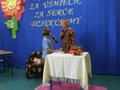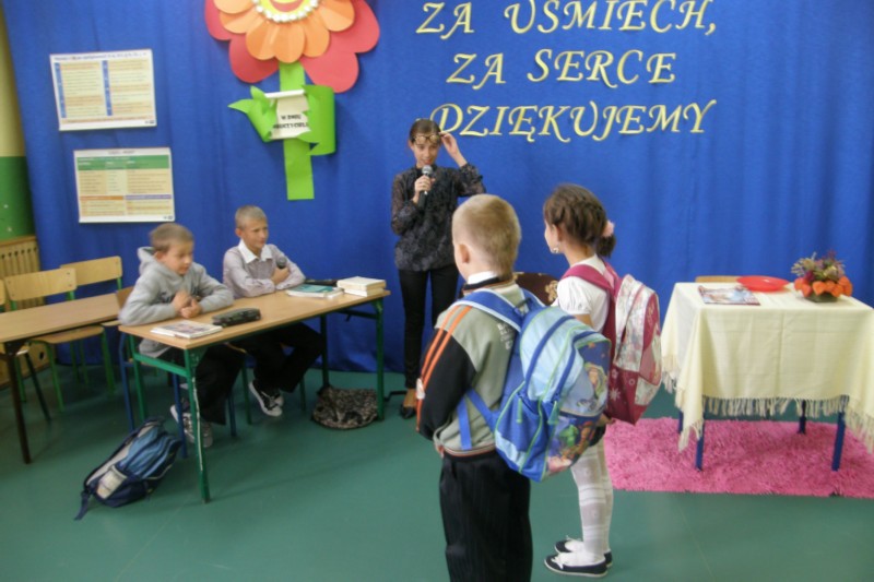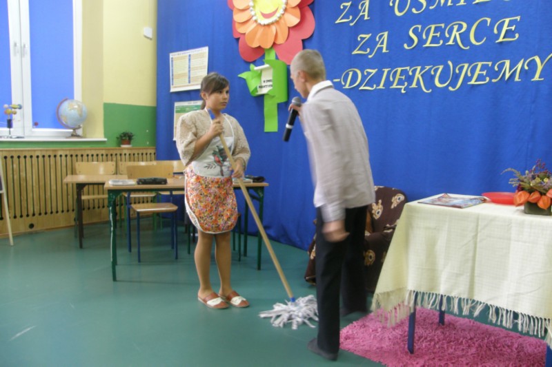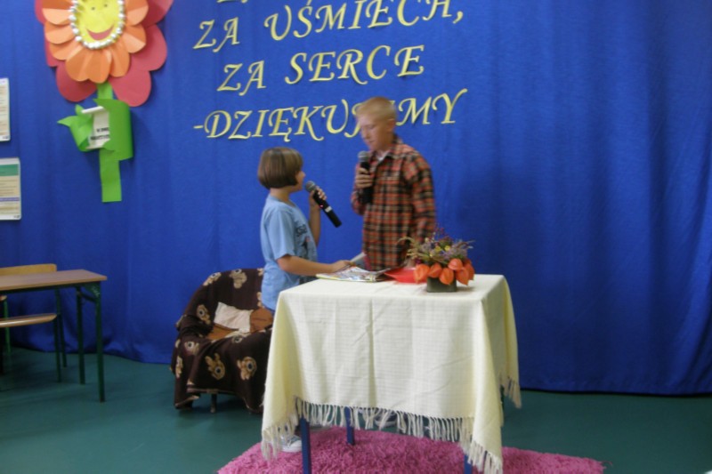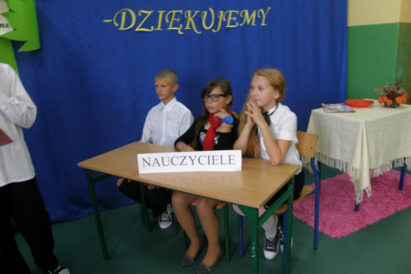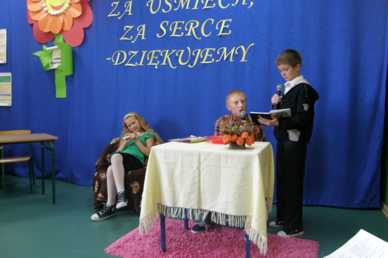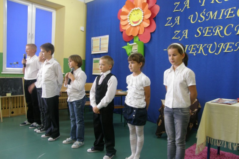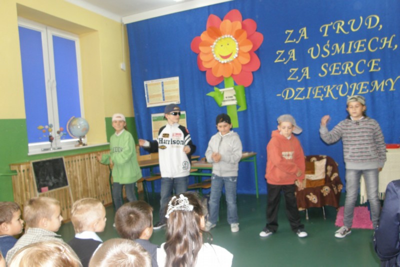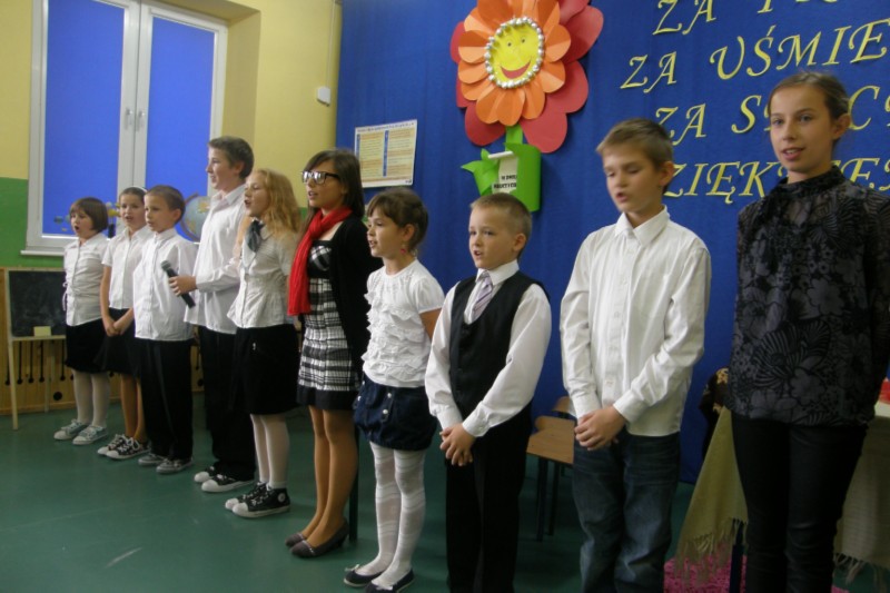 Dnia 13 października, jak co roku, obchodziliśmy Dzień Edukacji Narodowej. Na uroczystość przybyli oprócz dyrekcji szkoły, rodzice, emerytowani nauczyciele oraz przedstawiciele Samorządu Lokalnego. Dyrektor szkoły p.Beata Purgał podziękowała pracownikom szkoły za trud i wysiłek wkładany na co dzień w wychowanie młodego pokolenia. Głos zabrali również przedstawiciel samorządu życząc zadowolenia i radości z wykonywanej pracy. Uczniowie pod kierunkiem nauczycieli p. D. Hamczyk i p. E. Famulskiej przygotowali i zaprezentowali program artystyczny, w którym zabawne scenki domowe przeplatały się ze scenkami z życia szkoły, na koniec wszyscy obejrzeli parodię programu "Ciao Darwin", w której miały miejsce zmagania nauczycieli z uczniami. Zgromadzonych zachwyciły śpiewy, umiejętności aktorskie naszych uczniów oraz występ raperski. Mimo niezbyt sprzyjającej pogody za oknami wszyscy bawili się wspaniale.