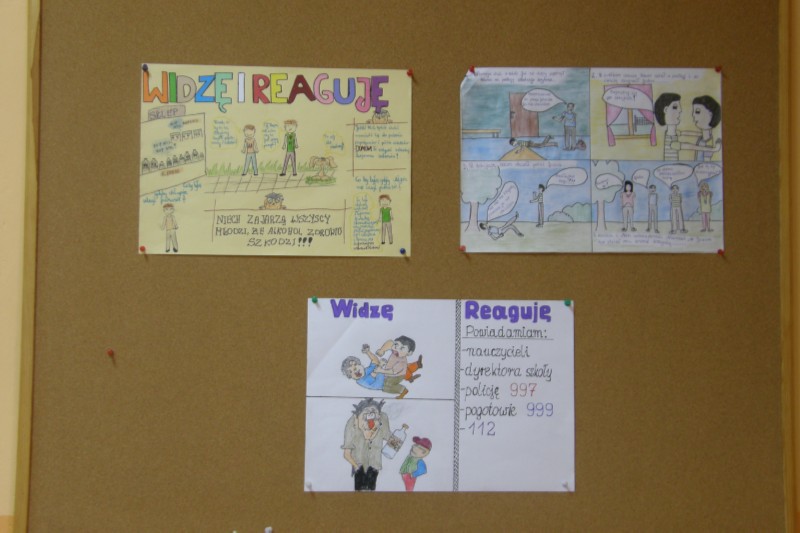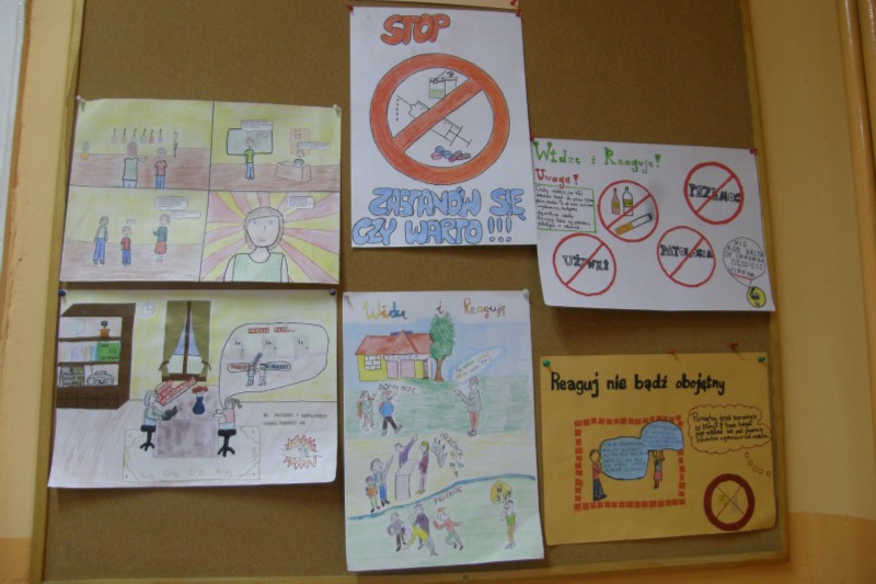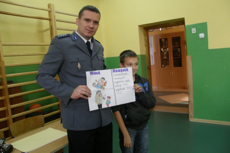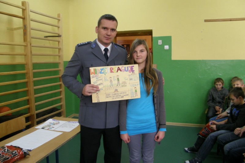 17 listopada 2011r. odbyło się w naszej szkole rozstrzygnięcie konkursu plastycznego pod hasłem "Widzę i reaguję" będącego podsumowaniem projektu realizowanego w klasie VI pod tym samym tytułem. Projekt "Widzę i reaguję " ma na celu budowanie poczucia odpowiedzialności za bezpieczeństwo innych oraz walkę z patologiami w szkołach. Tego dnia odwiedzili naszą szkołę pan nadkom. Marcin Dziubecki z Wydziału d/w z Przestępczością Narkotykową KMP w Piotrkowie Trybunalskim oraz pani Paulina Sikorska (ZSR CKP Bujny) - III LOp. Przeprowadzili z uczniami pogadankę na temat potencjalnych zagrożeń oraz informowali o sposobach reagowania na zjawiska patologiczne w ich otoczeniu. Wręczyli również nagrody za udział w konkursie, zwyciężyli w nim: Kinga Kołek, Martyna Purgał oraz Jakub Pawlikowski. Zwycięzcom gratulujemy!!!