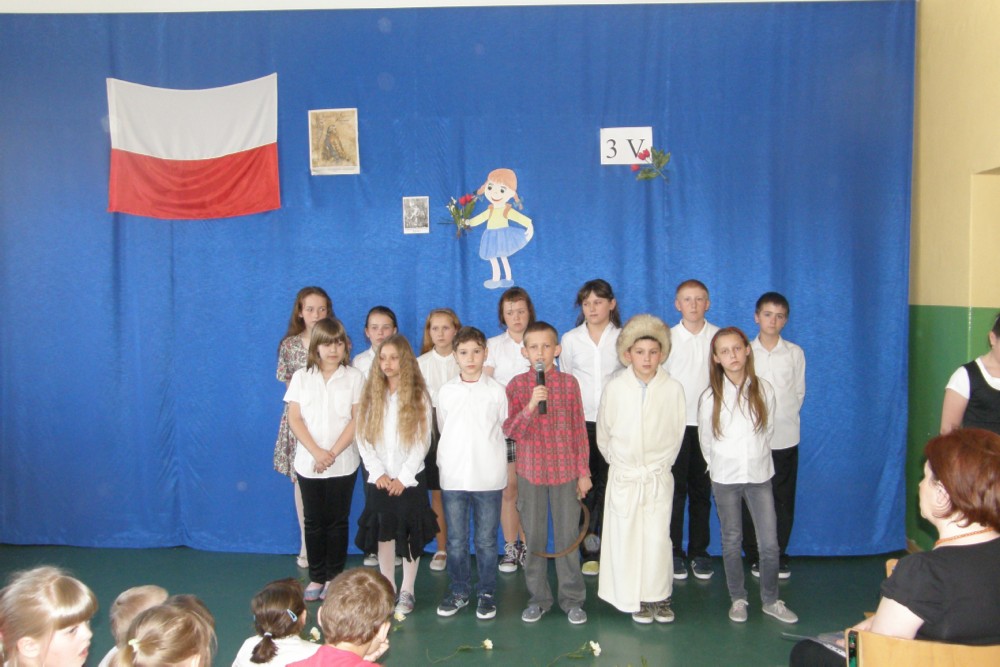 Dzwięki patriotycznych pieśni zabrzmiały w naszej szkole w dniu 30 kwietnia 2012 roku, dając początek obchodom rocznicy uchwalenia w 1791 roku Konstytucji 3 maja. Uczniowie, pod kierunkiem nauczycielki historii i języka polskiego - p. Iwony Krajewskiej, przygotowali montaż słowno-muzyczny przybliżający historię Sejmu Wielkiego i jego Twórców. Fragmenty poezji recytowanej przez młodzież odzwierciedlały trudne położenie Polski w II połowie XVIII wieku. Uroczystość stała się niepowtarzalną lekcją historii i patriotyzmu. Piękna recytacja, dźwięki patriotycznych pieśni i majowe słońce skłoniły do refleksji o ojczyźnie i miłości do niej.