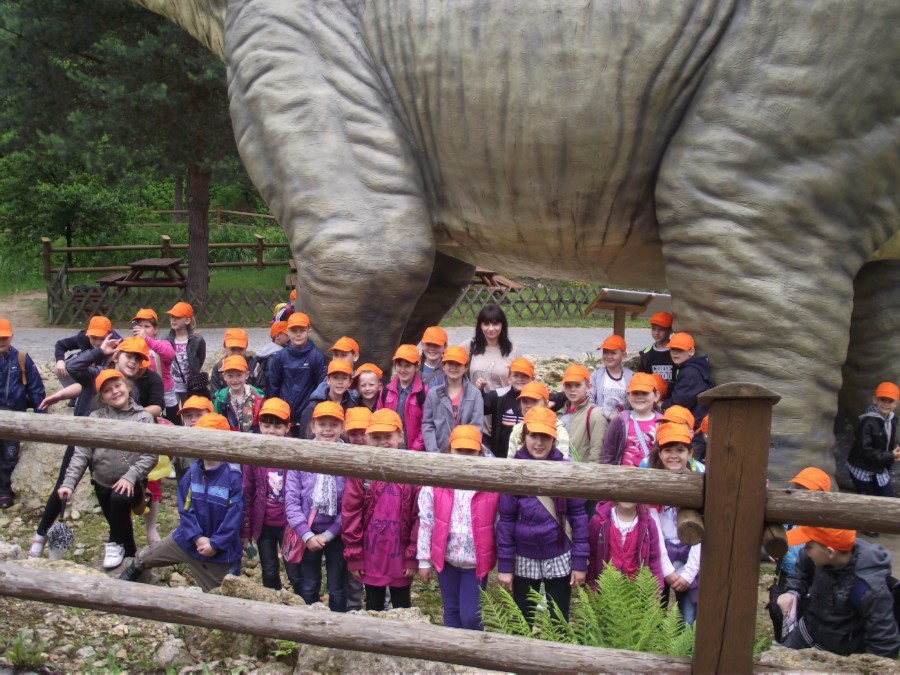 Pierwszym punktem wycieczki był Parku Jurajski. Na dziedzińcu spotkaliśmy się z miłą panią przewodnik, dzięki której idąc ścieżką edukacyjną wśród makiet dinozaurów w naturalnych wymiarach, zapoznaliśmy się z historią Ziemi, epokami geologicznymi i oczywiście życiem oraz zwyczajami największych gadów na ziemi. Najbardziej podobał nam się ogromny diplodok. |