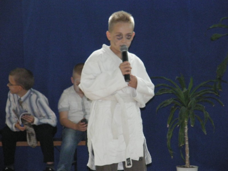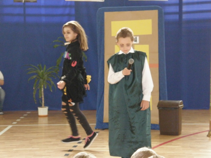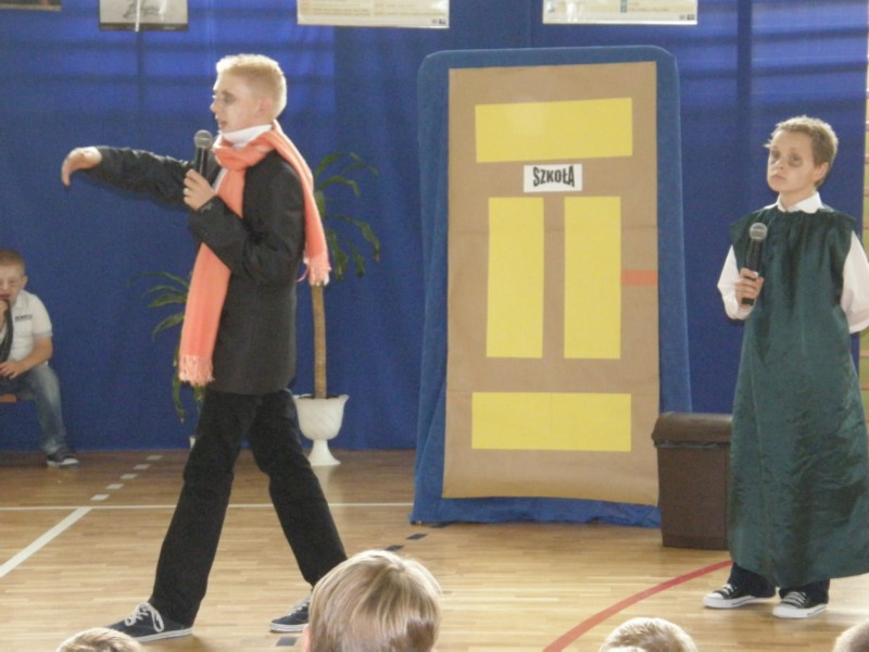 10.10.2013r. odbyła się w naszej szkole uroczysta akademia z okazji Dnia Edukacji Narodowej. Święto Komisji Edukacji Narodowej to dzień wyjątkowy i szczególny. To święto wszystkich pracowników oświaty. Niewątpliwą atrakcją stała się - przygotowana przez nasze dzieci, pod opieką p. Małgorzaty Janu, inscenizacja pt. "Straszny dwór", czyli godzina duchów i upiorów szkolnych". Uczniowie na moment wcielili się w intrygujące postacie: Torreadora, Karateki, Klasówki, Ściągawki, Moniuszki... prezentując w humorystyczny sposób życie naszej szkoły. Do przedstawienia wykorzystano znane motywy muzyczne (aria z Carmen, Mydełko Fa, Gdybym był bogaty...), do których napisano nowe teksty oraz ułożono wspaniałą choreografię. Inscenizacji towarzyszy klimat pełen grozy i tajemniczości. Akcja bowiem rozgrywa się o północy na szkolnym korytarzu. Placówkę nawiedzają wówczas duchy, zmory i upiory z uczniowskich koszmarów. Jest to obraz szkoły widzianej w krzywym zwierciadle, okraszony pozytywną dawką humoru. Wszyscy uczniowie, nauczyciele oraz zaproszeni goście – emerytowani pracownicy naszej szkoły, obejrzeli sceny, które na jawie nigdy się nie zdarzą.