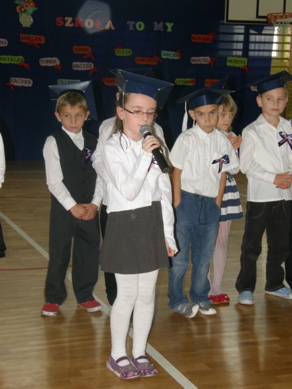 Dnia 7 listopada 2013 r. w naszej szkole miała miejsce uroczystość "Pasowania na ucznia". O godz. 10.00 zaproszeni goście licznie zgromadzili się w pięknie udekorowanej sali gimnastycznej. Oryginalną dekorację tworzyły imiona wszystkich pierwszoklasistów, pomysłowo wykonane przez wychowawczynię klasy – p. Bogumiłę Stasiów. Na początku dzieci przedstawiły program artystyczny złożony z wierszy i piosenek o przyjaźni, uczniach i szkole.