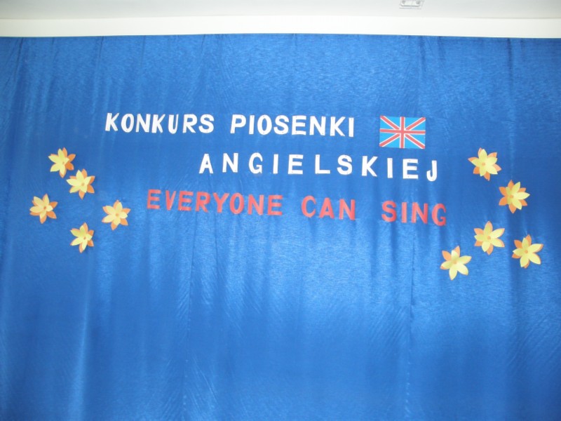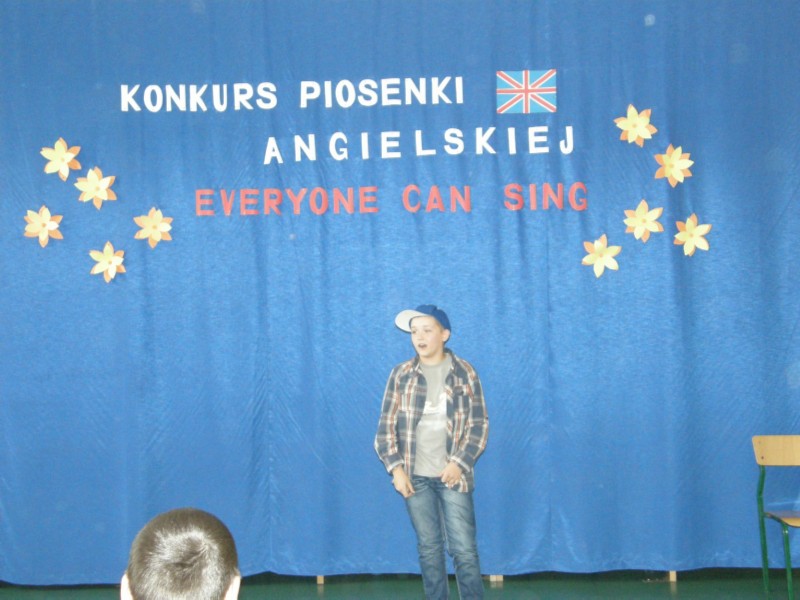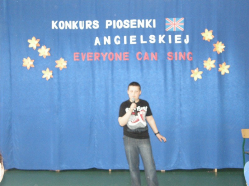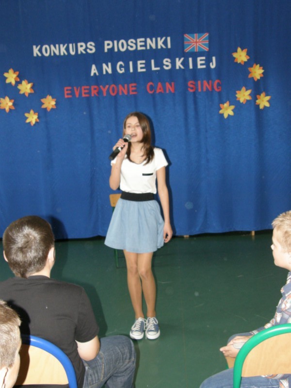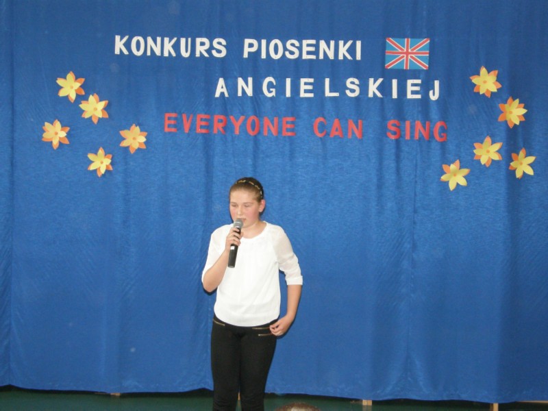 6 maja 2014 r. odbył się w naszej szkole konkurs piosenki angielskiej zorganizowany przez p. E. Buksę. W konkursie mogli brać udział uczniowie klas IV-VI , wystarczyło zaprezentować jedną piosenkę w języku angielskim. Jury w składzie: p. E. Buksa, p. A. Stobiecka i p. I. Krajewska brało pod uwagę poprawność wykonania piosenki w języku angielskim, warunki wokalne uczestnika oraz strój dobrany do utworu. Zainteresowanie konkursem było duże i mimo lekkiego stresu na początku, towarzyszyła przy tym wszystkim ( zarówno uczestnikom jak i widowni) dobra zabawa.