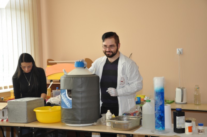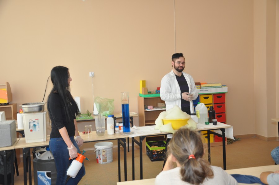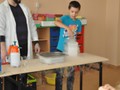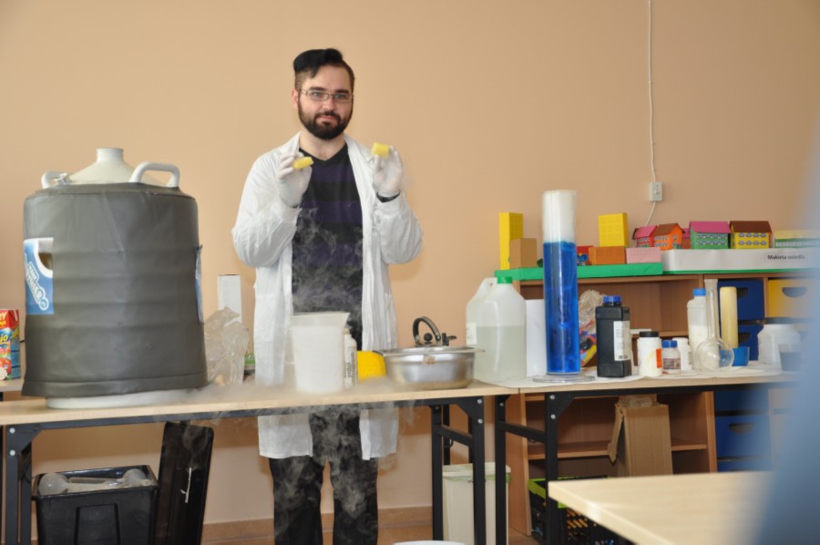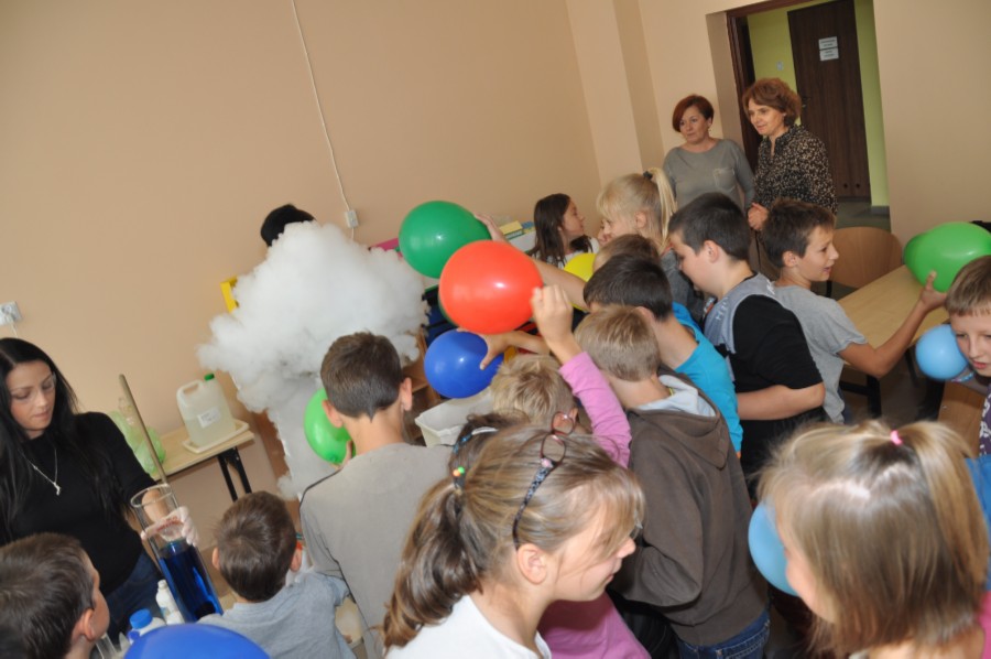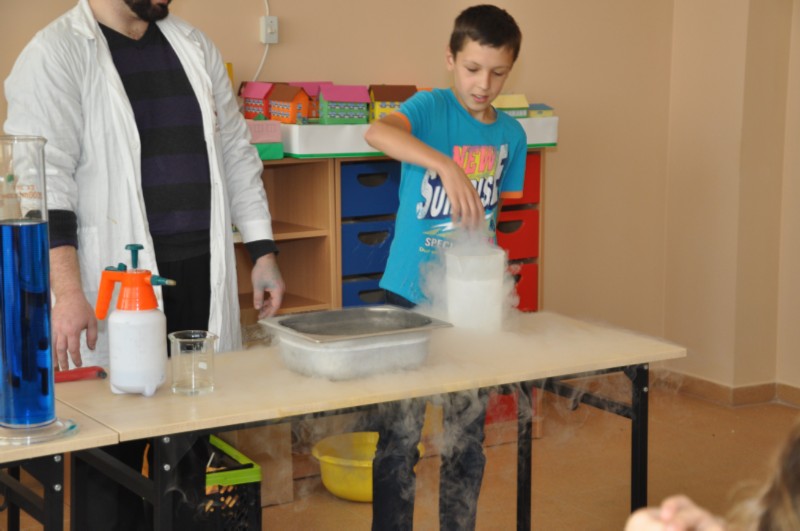 W dniu 29 września 2014 roku w naszej szkole odbył się pokaz doświadczeń chemicznych. W spotkaniu prowadzonym przez firmę Mały Inżynier uczestniczyły klasa V i VI. Uczniowie mieli okazję poznać wiele doświadczeń, między innymi z suchym lodem i ciekłym azotem. Obu substancjom dzięki ekstremalnie niskiej ich temperaturze towarzyszyła widowiskowa chłodna mgła. Ciekły azot wrze w temperaturze minus 195,8 °C, bulgocze jak wrzątek i szybko zamraża włożone do niego rzeczy, przez co kruszą się niczym szkło. Uczniowie widzieli ciekły ogień, papier znikający bez śladu po podpaleniu, sztuczną krew,barwienie i odbarwianie cieczy, duchy (opary amoniaku) i pastę dla słonia. Byli również świadkami zamrożenia nadmuchanego balonika i jego przywrócenia do nadmuchanej formy dzięki ciepłemu podmuchowi oddechu.