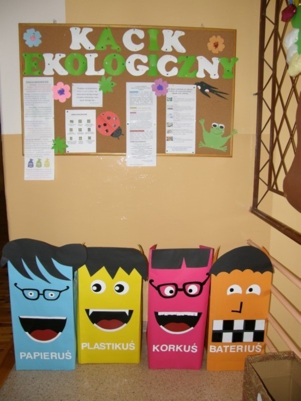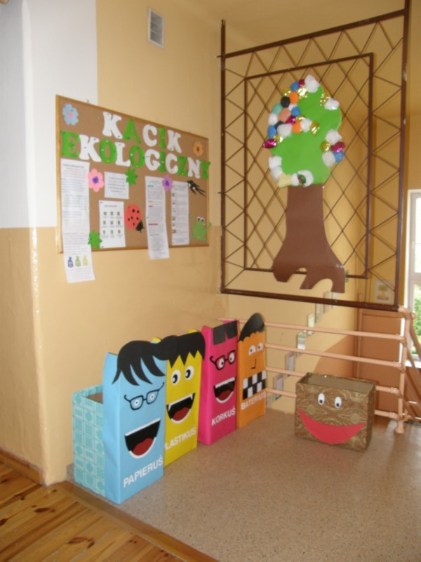 W październiku pojawił się na naszym szkolnym korytarzu kącik ekologiczny. Zorganizował go Samorząd Uczniowski pod opieką pani E. Famulskiej. Kącik ma na celu zapoznanie dzieci z zagrożeniami jakie niesie zaśmiecanie środowiska, zachęcić dzieci do selektywnych zbiórek na terenie naszej szkoły i do segregacji śmieci. Pozwala on na systematyczne przekazywanie wiedzy ekologicznej , z zakresu poznawania i ochrony przyrody, rozbudzenie zainteresowań i wyrobienie nawyków poszanowania przyrody w każdej okoliczności.